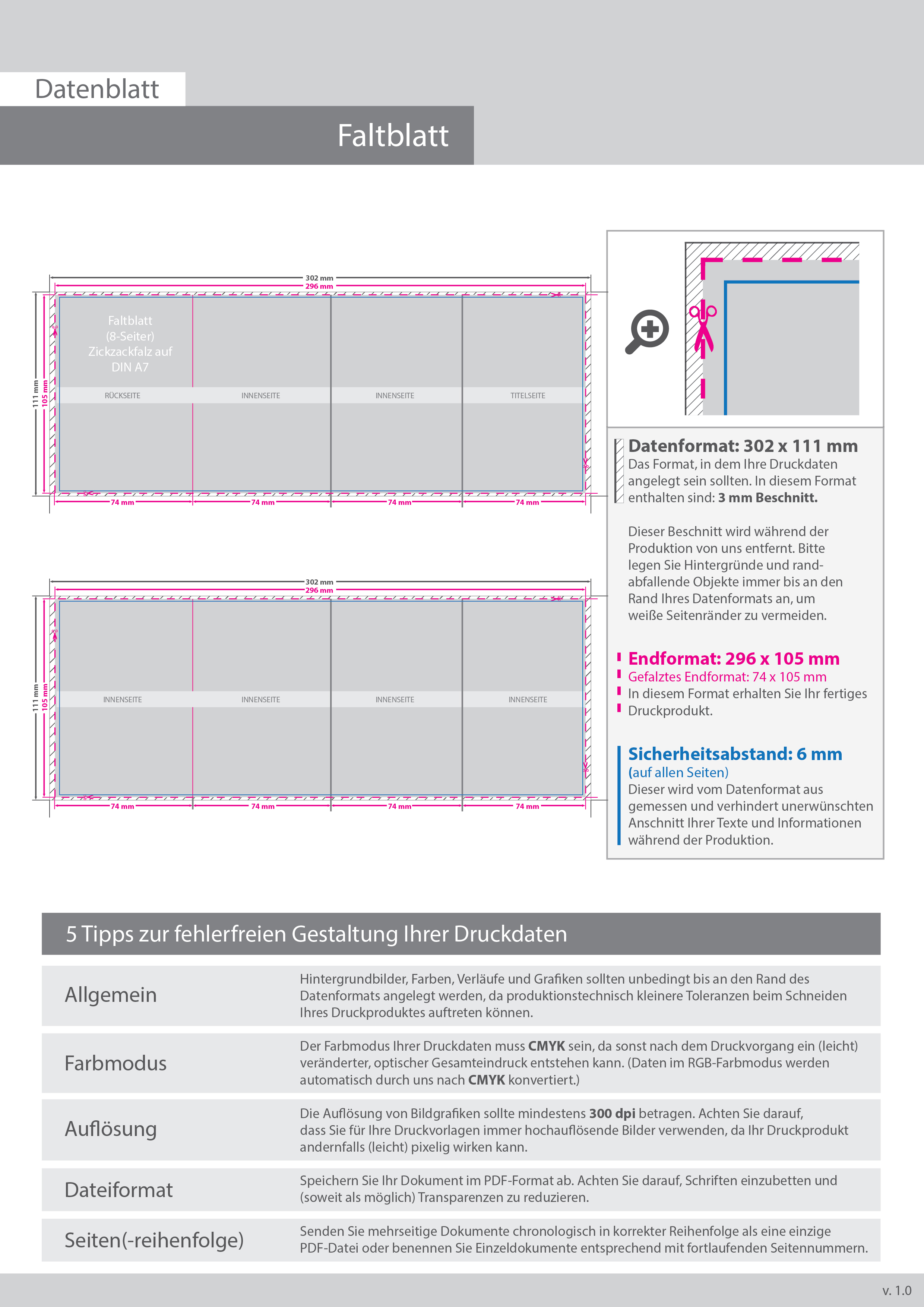 Hochglanz-UV-Lack Faltblatt, gefalzt auf DIN A7, vertikaler Zickzackfalz, 8-seitig